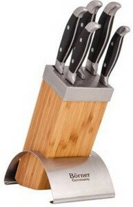 Набор Бёрнер "MEXICO " состоит из 6 предметов: деревянная подставка и 5 ножей изготовленных из кованной стали марки X50CrMoV15, ручки выполнены из дерева. Индивидуальная балансировка каждого ножа. Ножи удобно хранить в деревянной подставке выполненной из бамбука и металла. Она входит в комплект. Твердость стали: HRC 56+/-1.
